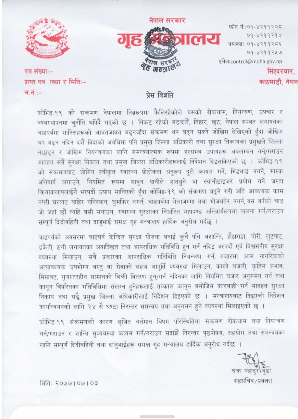 आवश्यक कामबाहेक घर बाहिर ननिस्कन, घुमफिर नगर्न, चाडपर्वमा भेला, भोजभतेर नगर्न तथा जो–जहाँ छ, त्यहीँ बसेर पर्व मनाउन समेत आग्रह गरेको छ ।