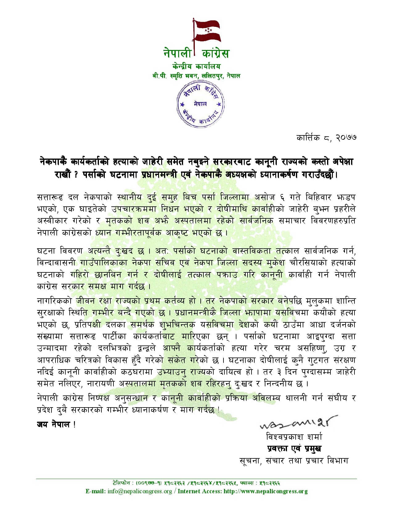 नेपाली कांग्रेसको सूचना, सञ्चार तथा प्रचार विभाग प्रमुख तथा प्रवक्ता विश्वप्रकाश शर्माले प्रेस विज्ञप्ति जारी गर्दै दोषीमाथि कारवाही गर्न माग गर्नुभएको छ । ‘घटनाका दोषीलाई कुनै गुटगत संरक्षण नदिई कानूनी कारवाहीको कठघरामा उभ्याउनु राज्यको दायित्व हो । तर ३ दिन पुग्दासम्म जाहेरी समेत नलिएर, नारायणी अस्पतालमा मृतकको शव रहिरहनु दुःखद र निन्दनीय छ,’ उहाँले विज्ञप्तिमा लेख्नुभएको छ, ‘नेपाली कांग्रेस निष्पक्ष अनुसन्धान र कानूनी कारवाहीको प्रक्रिया अविलम्ब थालनी गर्न संघीय र प्रदेश दुवै सरकारको गम्भीर ध्यानाकर्षण र माग गर्दछ ।’