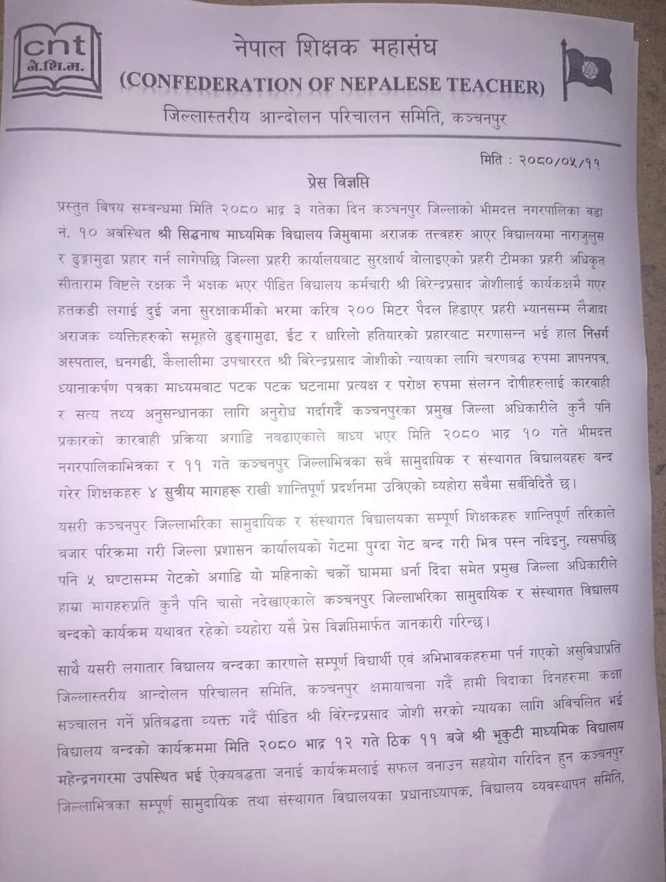 सोमबार जिल्ला प्रशासन कार्यालय कञ्चनपुरको गेटमा चर्काे घाममा ५ घण्टासम्म धर्ना दिँदा पनि मागप्रति कुनै चासो नदेखाएकाले विद्यालय बन्दको कार्यक्रम यथावत रहेको जनाइएको छ ।