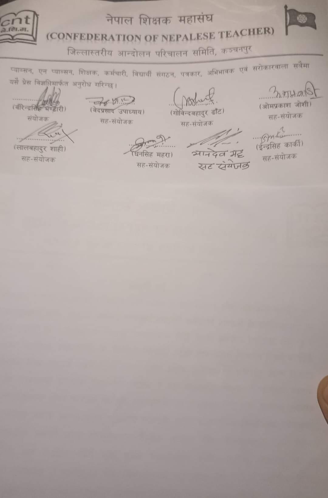 महेन्द्रनगर । कञ्चनपुरमा आन्दोलनरत नेपाल शिक्षक महासंघले मंगलवारका लागि नयाँ आन्दोलनको कार्यक्रम सार्वजनिक गरेको छ ।