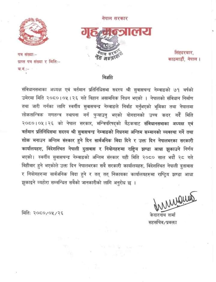 मन्त्रालयका प्रवक्ता सहसचिव केदारनाथ शर्माले आज मंगलबार विज्ञप्ति जारी गर्दै संविधानसभा अध्यक्ष सुवासचन्द्र नेम्वाङको अन्त्येष्टि हुने दिन बिहीबार बिदा हुने जानकारी दिए ।