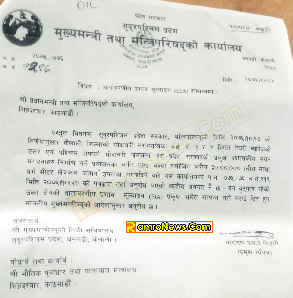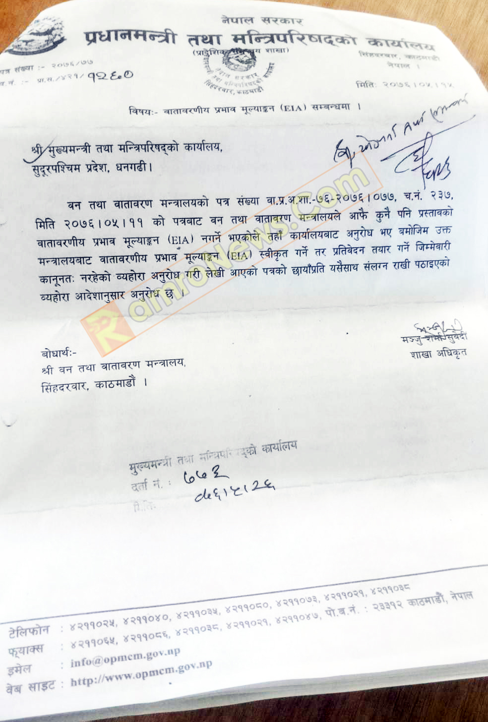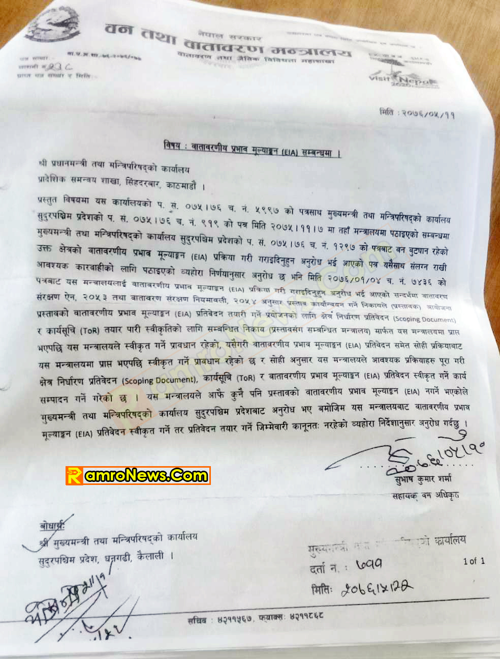 मुख्यमन्त्री कार्यालयले लेखेको पत्र प्रधानमन्त्री कार्यालय हुँदै वन तथा वातावरण मन्त्रालय पुग्यो । पत्र पाएपछि वन मन्त्रालयले २०७६/०५/११ गते प्रधानमन्त्री कार्यालयलाई जवाफ फर्कायो । वन मन्त्रालयका सहायक वन अधिकृत सुभाष कुमार शर्माले लेखेको पत्रमा उल्लेख छ, ‘वातावरण संरक्षण ऐन २०५३ तथा वातावरण संरक्षण नियमावली २०५४ अनुसार प्रस्ताव कार्यान्वयन गर्ने निकायले (प्रस्तावक) आयोजना प्रस्तावको वातावरणीय प्रभाव मूल्यांकन (ईआईए) प्रतिवेदन तयारी गर्ने प्रयोजनको लागि क्षेत्र निर्धारण प्रतिवेदन र कार्यसूची (टीओआर) तयार पारी स्वीकृतिको लागि सम्बन्धित निकाय (प्रस्तावसँग सम्बन्धित मन्त्रालय) मार्फत यस मन्त्रालयमा प्राप्त भएपछि यस मन्त्रालयले स्वीकृत गर्ने प्रावधान रहेको, यसैगरी वातावरणीय प्रभाव मूल्यांकन (ईआईए) प्रतिवेदन समेत सोही प्रक्रियाबाट यस मन्त्रालयमा प्राप्त भएपछि स्वीकृत गर्ने प्रावधान रहेको छ र सोहीअनुसार यस मन्त्रालयले आवश्यक प्रक्रियाहरू पूरा गरी क्षेत्र निर्धारण प्रतिवेदन, कार्यसूची र वातावरण प्रभाव मूल्यांकन प्रतिवेदन स्वीकृत गर्ने कार्य सम्पादन गर्ने गरेको छ । यस मन्त्रालयले आफैं कुनै पनि प्रस्तावको वातावरणीय प्रभाव मूल्यांकन (ईआईए) नगर्ने भएकोले मुख्यमन्त्री तथा मन्त्रिपरिषद्को कार्यालय सुदूरपश्चिम प्रदेशबाट अनुरोध भएबमोजिम यस मन्त्रालयबाट वातावरणीय प्रभाव मूल्यांकन (ईआईए) प्रतिवेदन स्वीकृत गर्ने तर प्रतिवेदन तयार गर्ने जिम्मेवारी कानूनतः नरहेको व्यहोरा निर्देशानुसार अनुरोध गर्दछु ।’