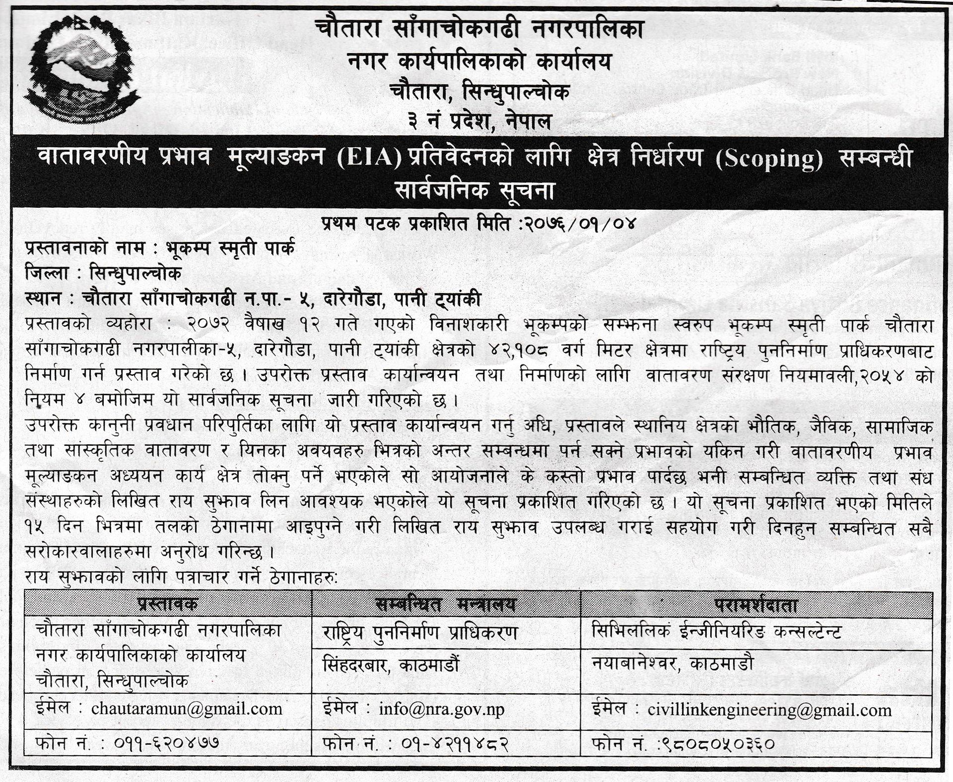 अन्त्यमा एउटा उदाहरण हेरौं । सिन्धुपाल्चोकको चौतारा साँगाचोकगढी नगरपालिकाले ईआईए प्रतिवेदनको लागि क्षेत्र निर्धारण सम्बन्धी सार्वजनिक सूचना प्रकाशित गरेको रहेछ । हेर्नुहोस् सूचना –