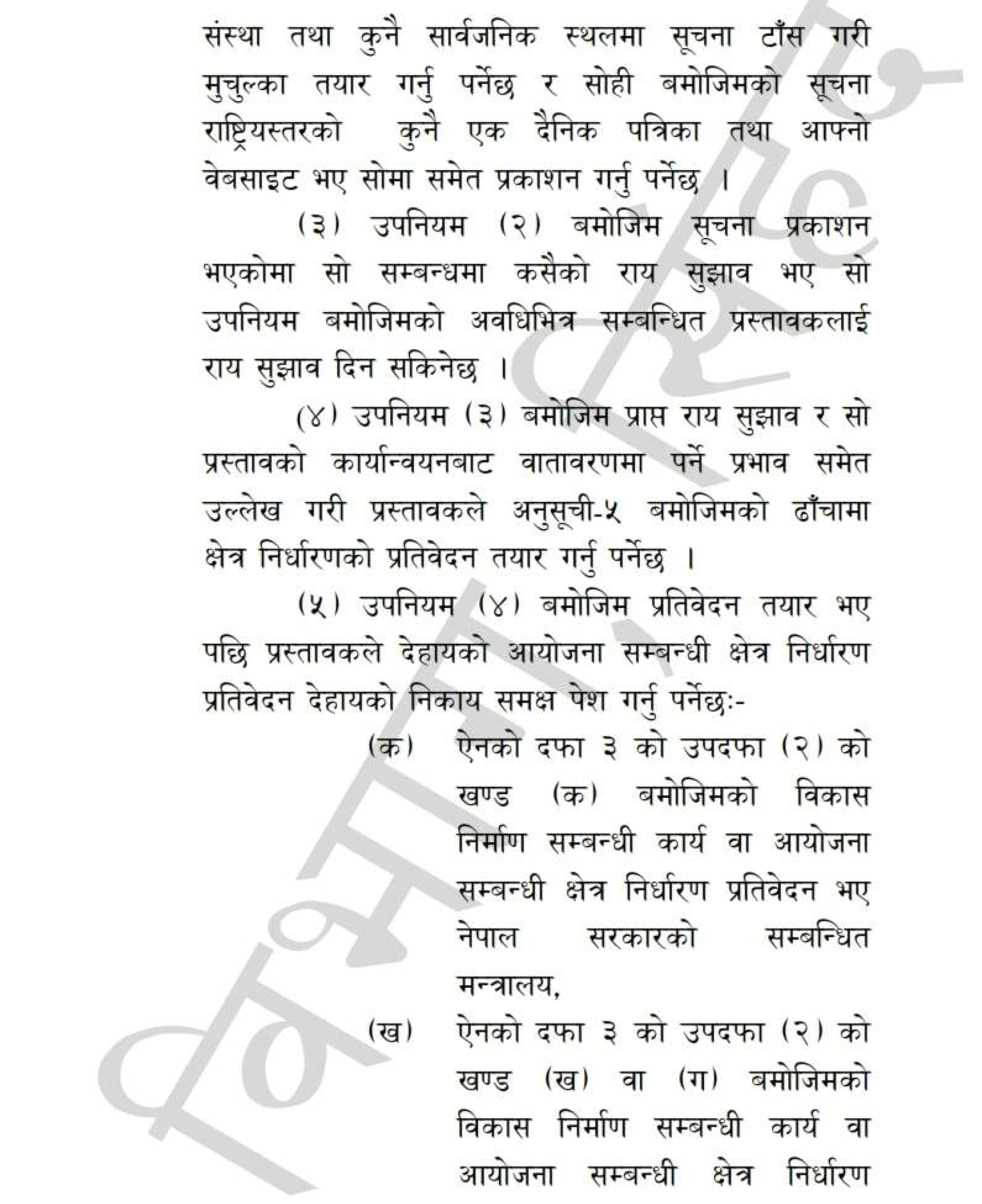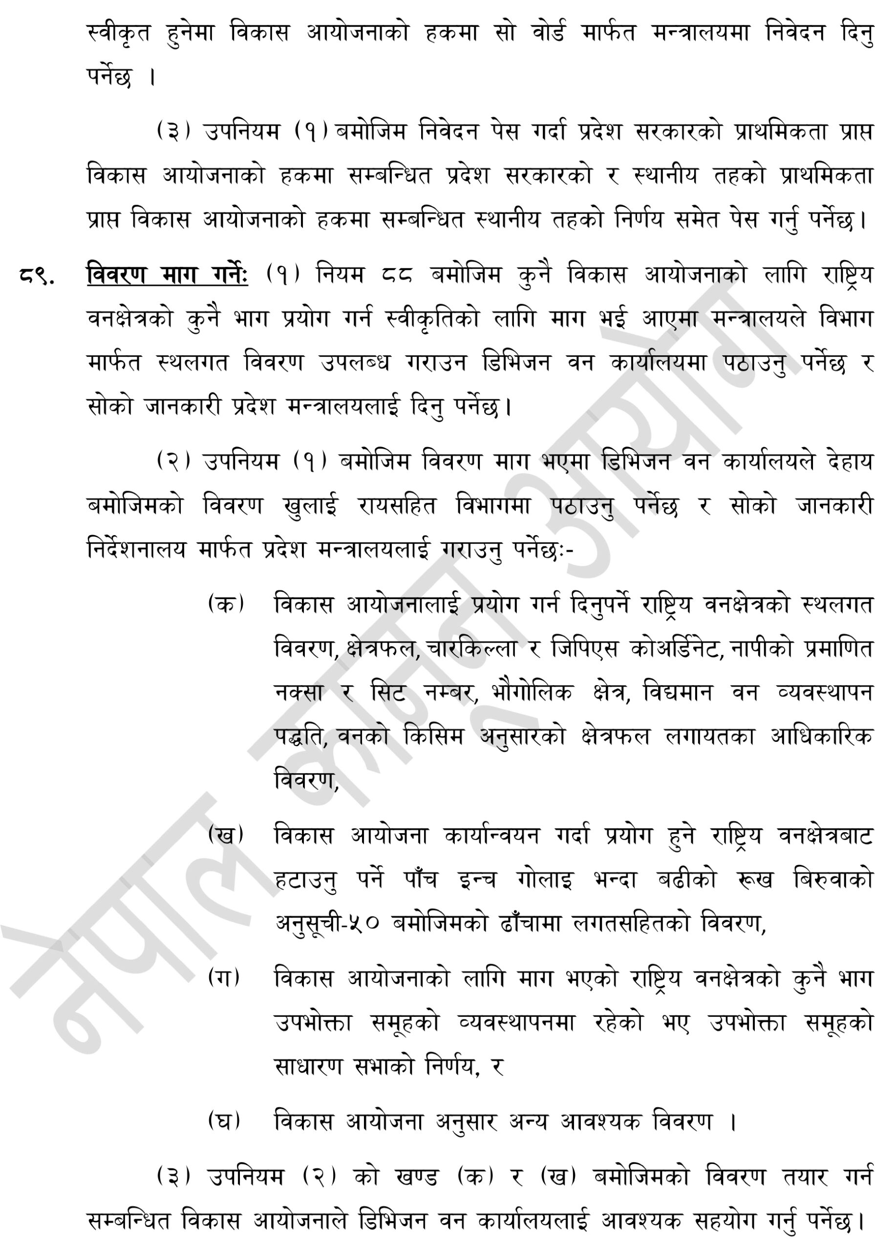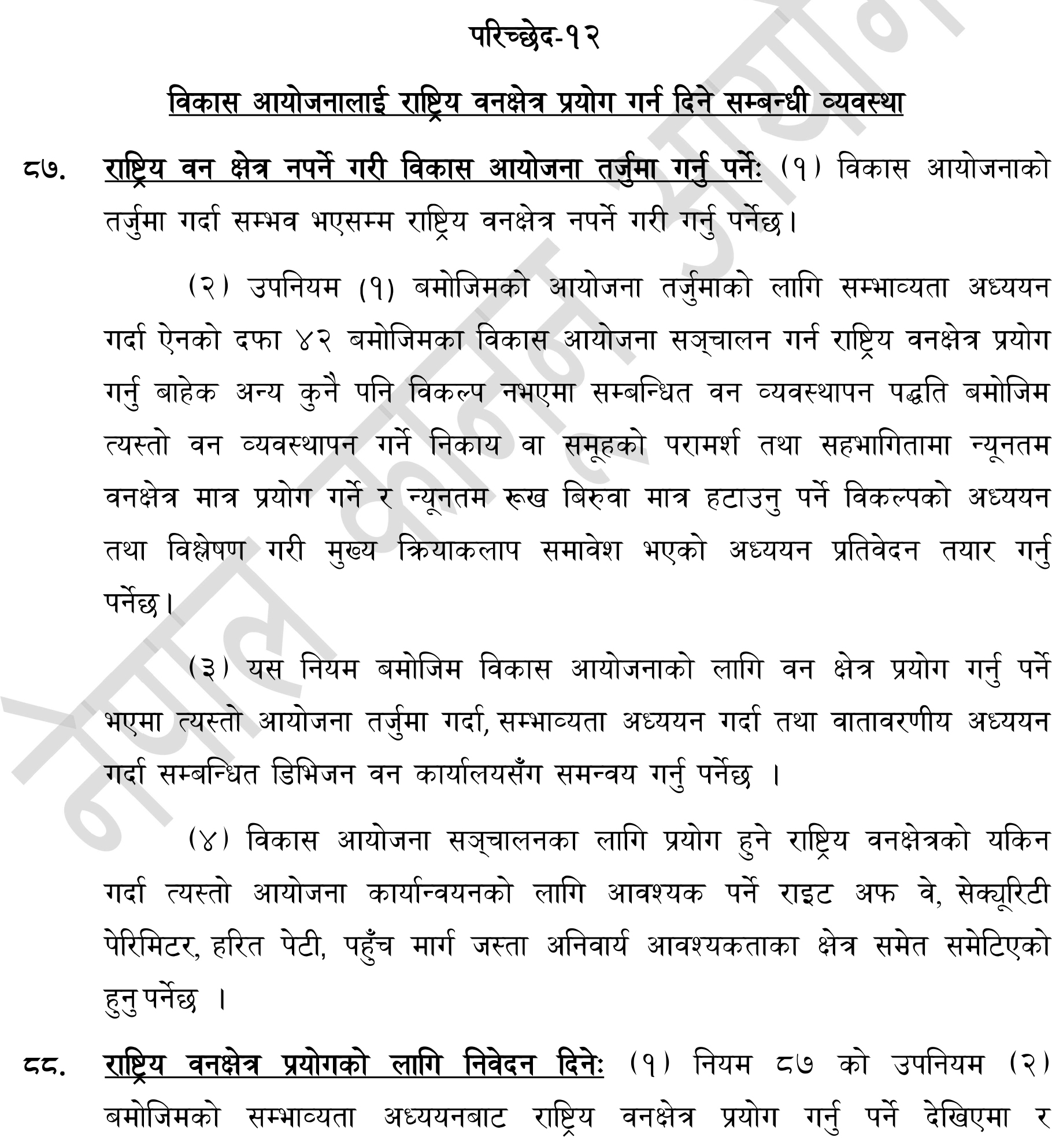 वन नियमावली २०७९ को नियम ८७ मा ‘सम्बन्धित वन व्यवस्थापन पद्धति बमोजिम त्यस्तो वन व्यवस्थापन गर्ने निकाय वा समूहको परामर्श तथा सहभागितामा न्यूनतम वन क्षेत्र मात्र प्रयोग गर्ने र न्यूनतम रुख बिरुवा मात्र हटाउनुपर्ने विकल्पको अध्ययन तथा विश्लेषण गरी मुख्य क्रियाकलाप समावेश भएको अध्ययन प्रतिवेदन तयार गर्नुपर्ने’ उल्लेख छ । नियमावलीले डिभिजन वन कार्यालय र सामुदायिक वन उपभोक्ता समूहसँग पनि परामर्श हुनुपर्ने परिकल्पना गरेको छ तर प्रदेश सरकारले यी निकायसँग परामर्श गरेको देखिँदैन ।