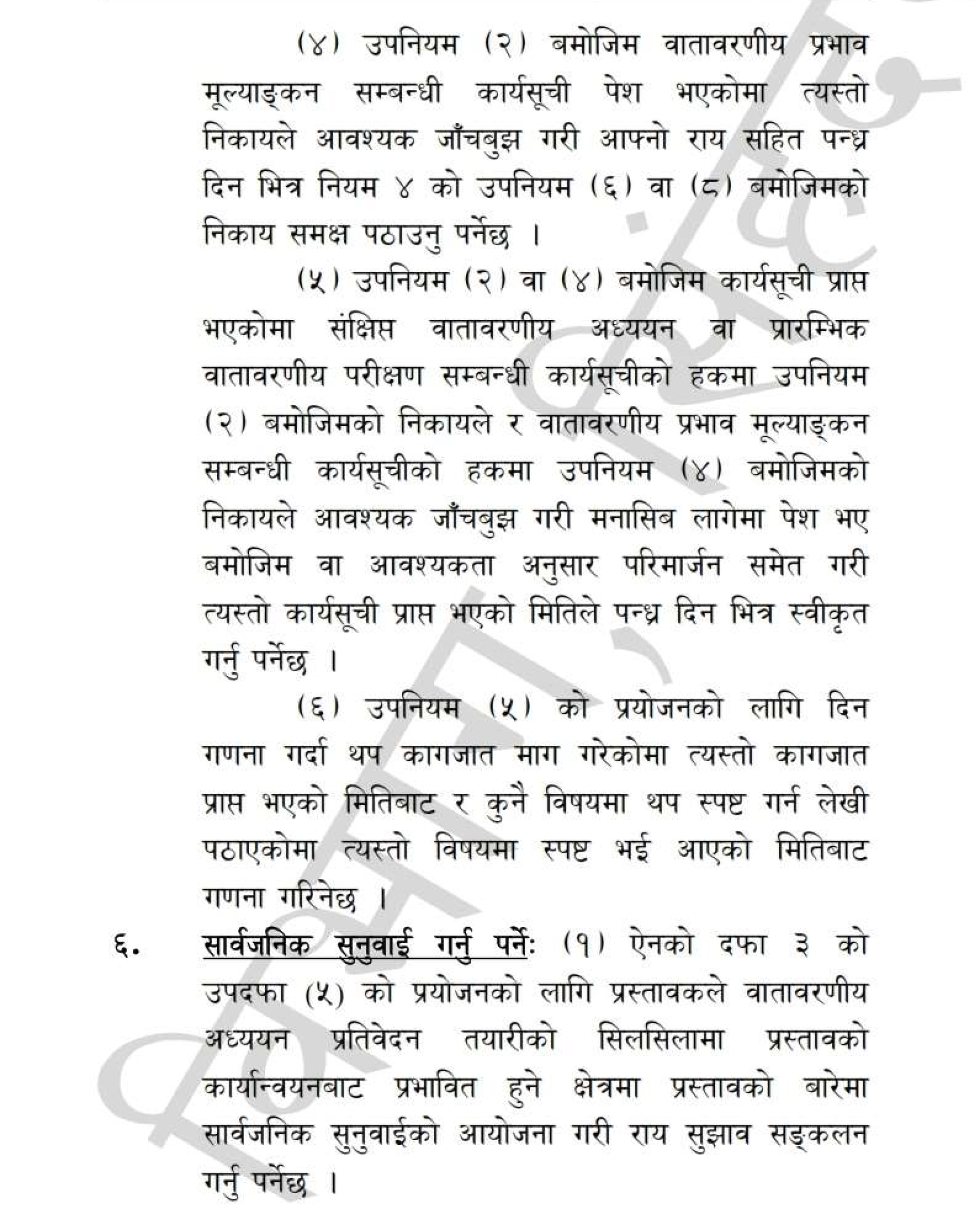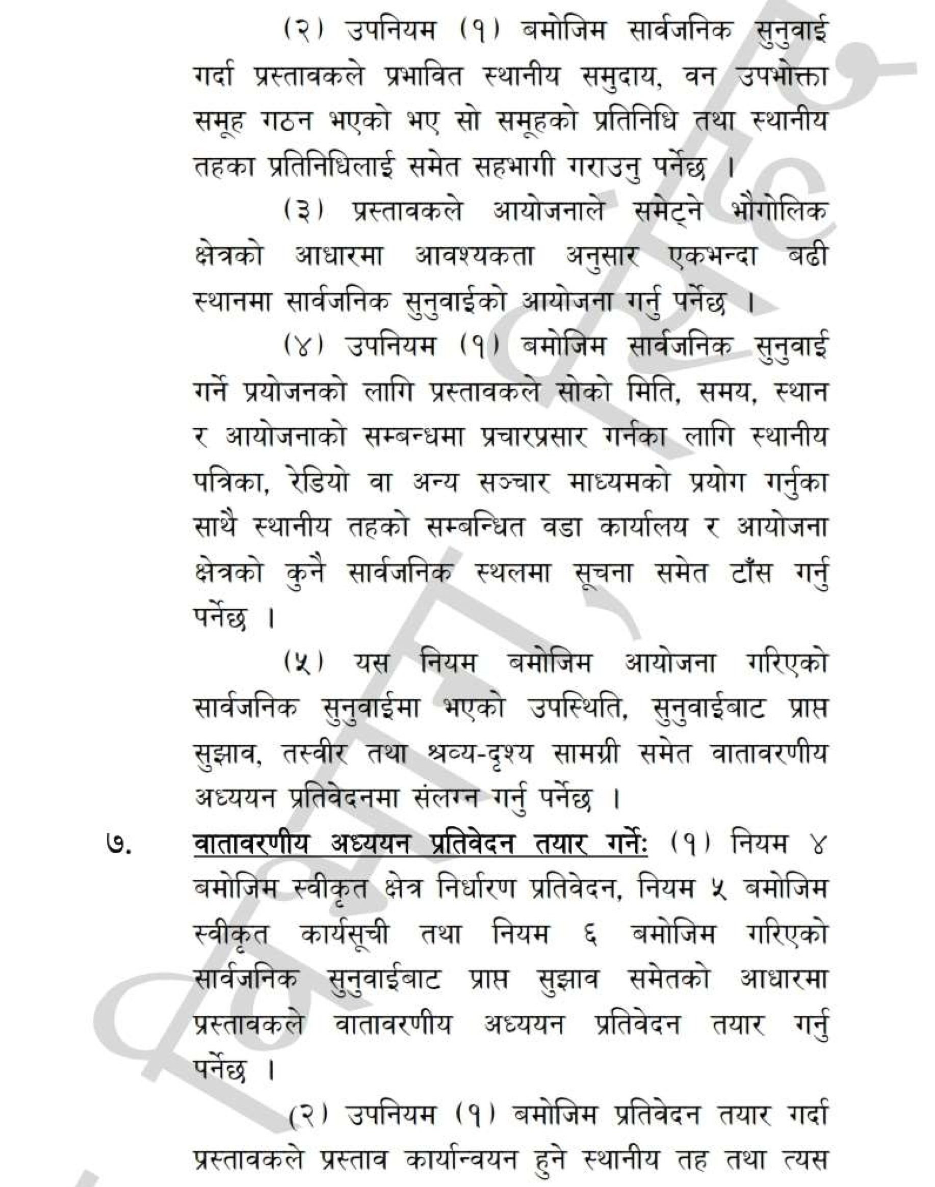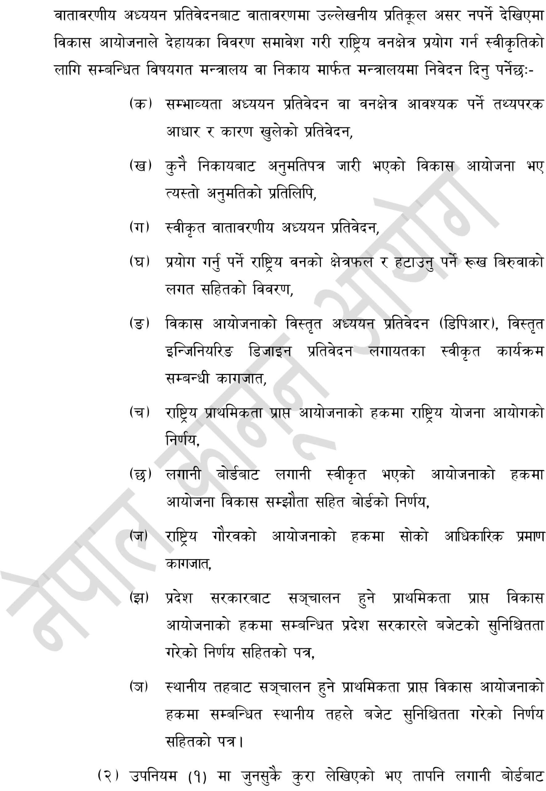मन्त्रालयको वन क्षेत्र भूउपयोग शाखाका उपसचिव परशुराम पौडेलले वन क्षेत्र प्रयोग गर्नुअघि वातारणीय प्रभाव मूल्यांकन गर्नैपर्ने बताए । ‘त्यसअघि क्षेत्र निर्धारण र कार्यसूची स्वीकृत गराउनुपर्छ । त्यो स्वीकृत भएपछि ईआईए बनाउनुपर्छ । सम्बन्धित सामुदायिक वनको साधारण सभाको निर्णय चाहिन्छ । कानून बमोजिमका सबै प्रक्रिया पुर्‍याएपछि मात्रै मन्त्रिपरिषद्ले निर्णय गर्ने हो, सोझै वन क्षेत्र प्रयोग गर्न दिन मिल्दैन ।’