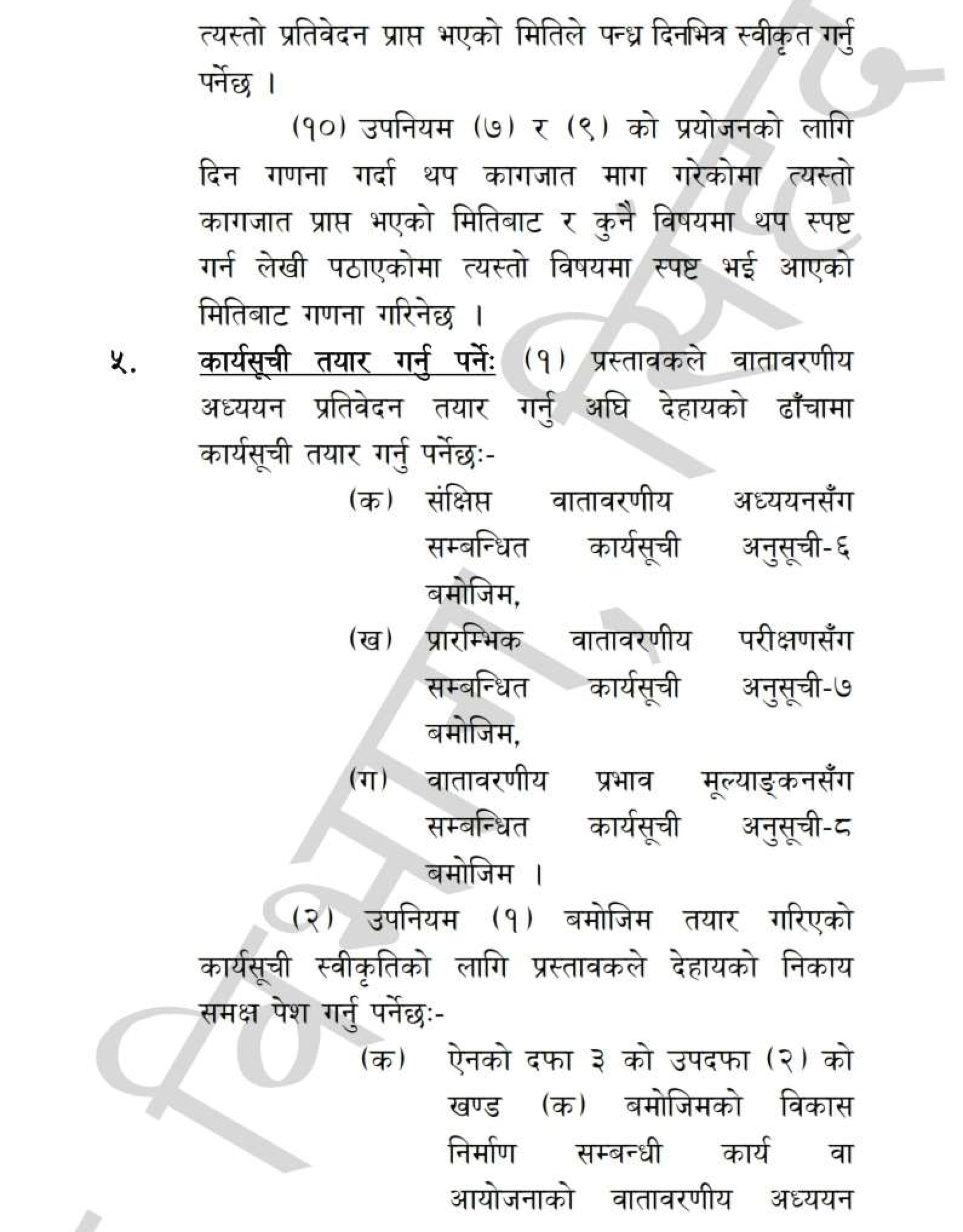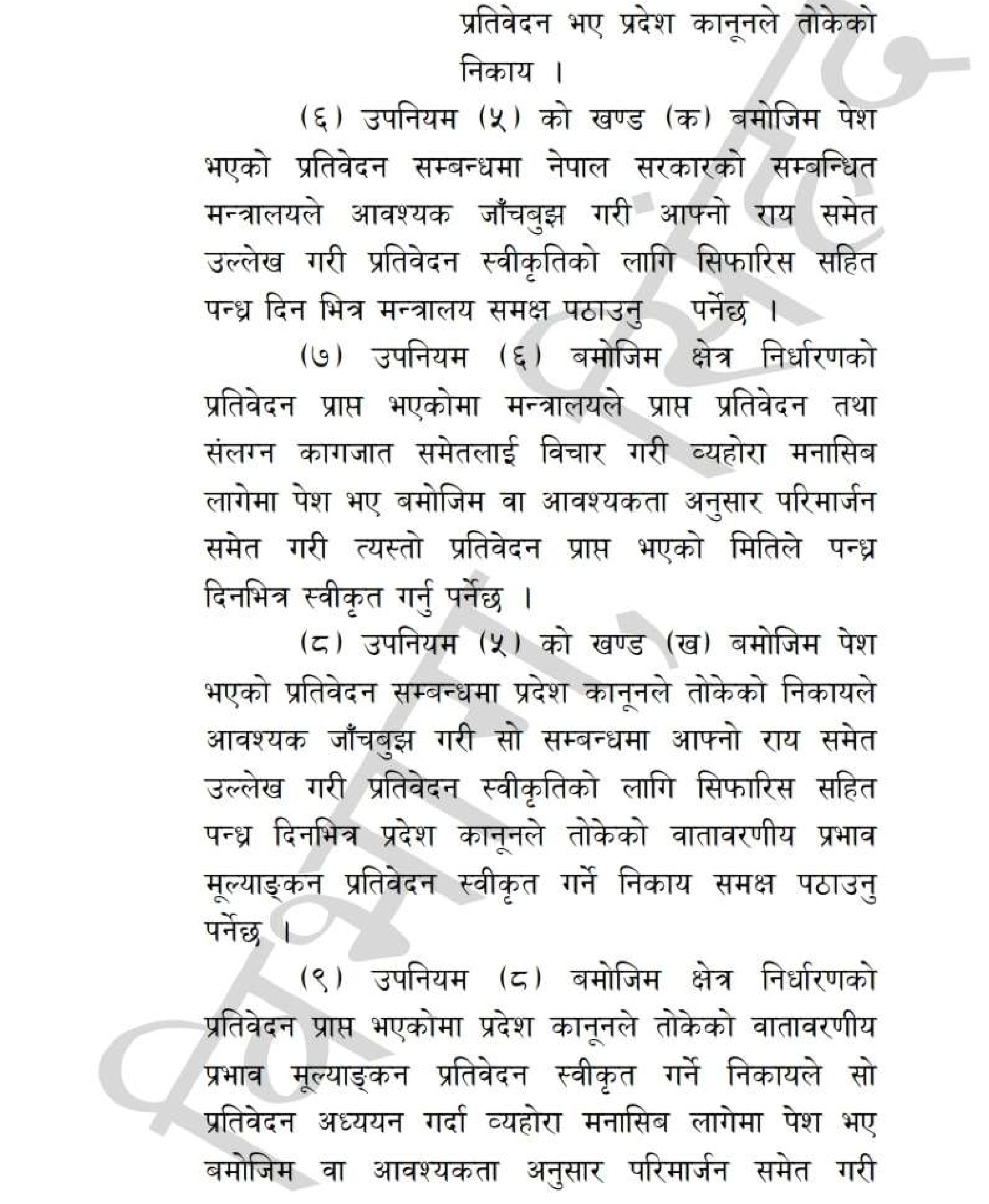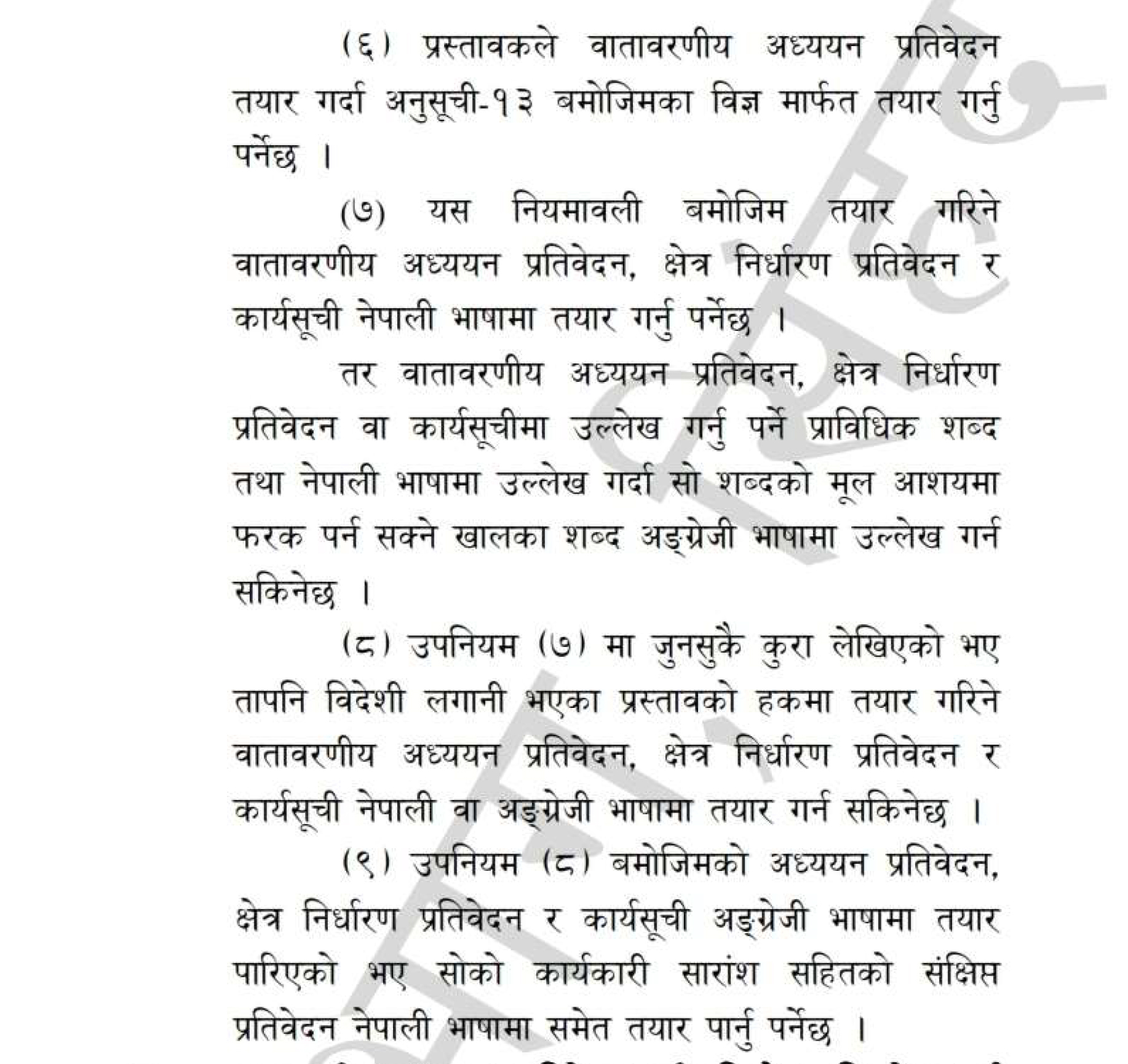 मन्त्रालयको वन क्षेत्र भूउपयोग शाखाका उपसचिव परशुराम पौडेलले वन क्षेत्र प्रयोग गर्नुअघि वातारणीय प्रभाव मूल्यांकन गर्नैपर्ने बताए । ‘त्यसअघि क्षेत्र निर्धारण र कार्यसूची स्वीकृत गराउनुपर्छ । त्यो स्वीकृत भएपछि ईआईए बनाउनुपर्छ । सम्बन्धित सामुदायिक वनको साधारण सभाको निर्णय चाहिन्छ । कानून बमोजिमका सबै प्रक्रिया पुर्‍याएपछि मात्रै मन्त्रिपरिषद्ले निर्णय गर्ने हो, सोझै वन क्षेत्र प्रयोग गर्न दिन मिल्दैन ।’