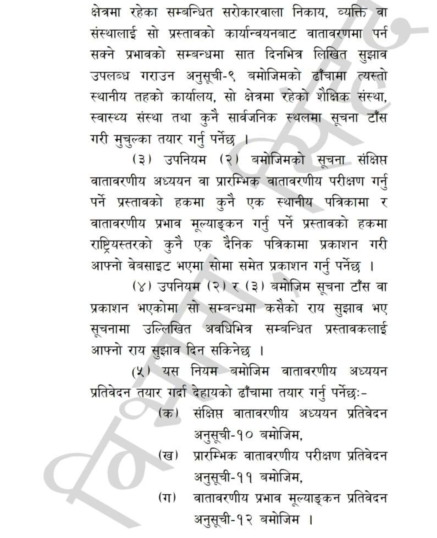 वातावरणीय प्रभाव मूल्यांकन (ईआईए) सम्बन्धी विस्तृत व्यवस्था वातावरण संरक्षण ऐन २०७६ र वातावरण संरक्षण नियमावली २०७७ मा गरिएको छ । नियमावलीको व्यवस्था यस्तो छ –
