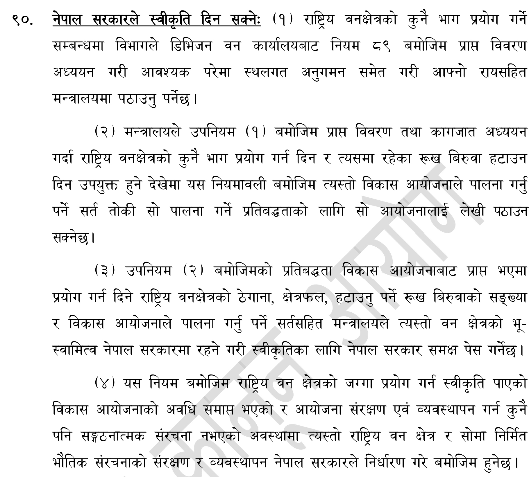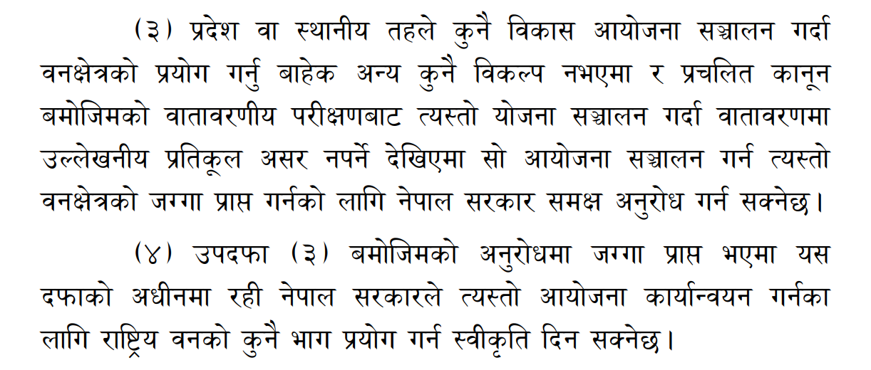 वन ऐन २०७६ को दफा ४२. ले वन क्षेत्रको प्रयोग गर्न सकिने सम्बन्धी व्यवस्था गरेको छ । दफा ४२ को उपदफा (३) र (४) मा लेखिएको छ, ‘(३) प्रदेश वा स्थानीय तहले कुनै विकास आयोजना सञ्चालन गर्दा वन क्षेत्रको प्रयोग गर्नुबाहेक अन्य कुनै विकल्प नभएमा र प्रचलित कानून बमोजिमको वातावरणीय परीक्षणबाट त्यस्तो योजना सञ्चालन गर्दा वातावरणमा उल्लेखनीय प्रतिकूल असर नपर्ने देखिएमा सो आयोजना सञ्चालन गर्न त्यस्तो वन क्षेत्रको जग्गा प्राप्त गर्नको लागि नेपाल सरकारसमक्ष अनुरोध गर्न सक्नेछ । (४) उपदफा (३) बमोजिमको अनुरोधमा जग्गा प्राप्त भएमा यस दफाको अधीनमा रही नेपाल सरकारले त्यस्तो आयोजना कार्यान्वयन गर्नका लागि राष्ट्रिय वनको कुनै भाग प्रयोग गर्न स्वीकृति दिन सक्नेछ ।’