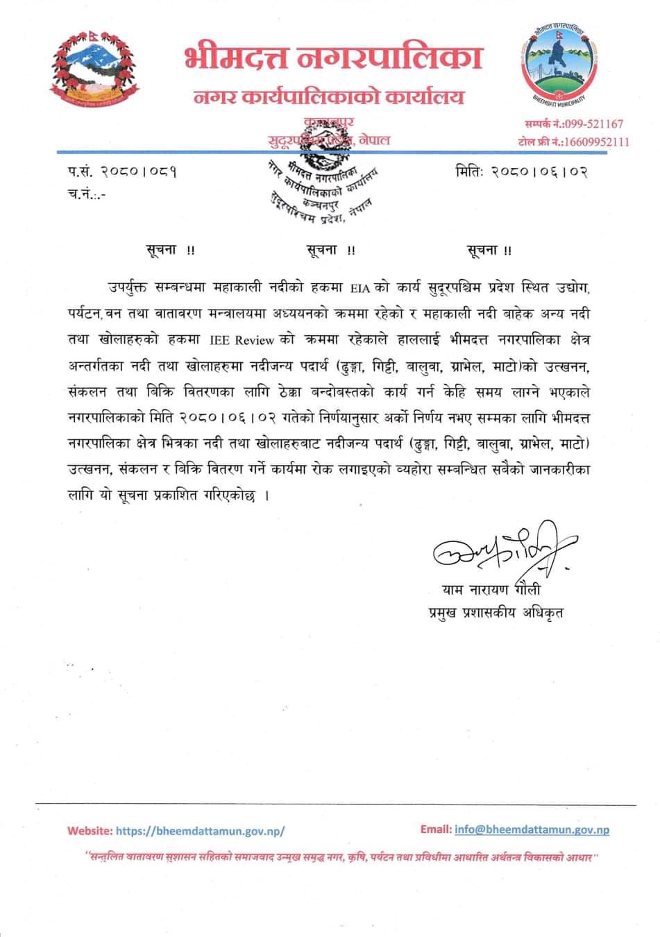 अन्ततः भीमदत्त नगरपालिका झस्कियो, महाकाली नदीबाट गिट्टी, बालुवा संकलनमा रोक