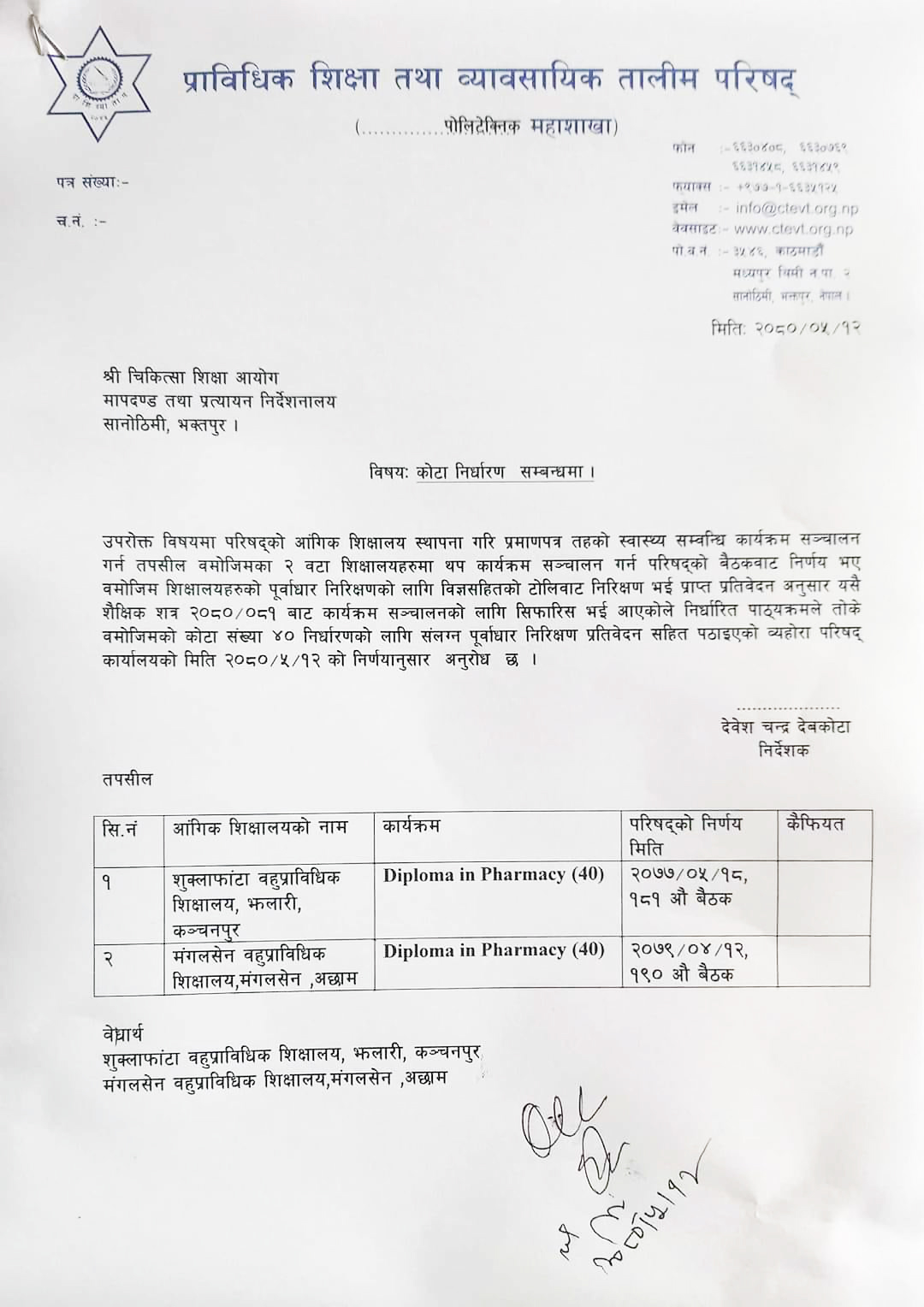प्राविधिक शिक्षा तथा व्यावसायिक तालिम परिषद् (सीटीईभीटी) ले ४० विद्यार्थीको सिट संख्या निर्धारण गर्न चिकित्सा शिक्षा आयोगमा पत्राचार गरेको छ । आयोगले कोटा निर्धारण गरेपछि भर्नाका लागि बाटो खुल्नेछ ।