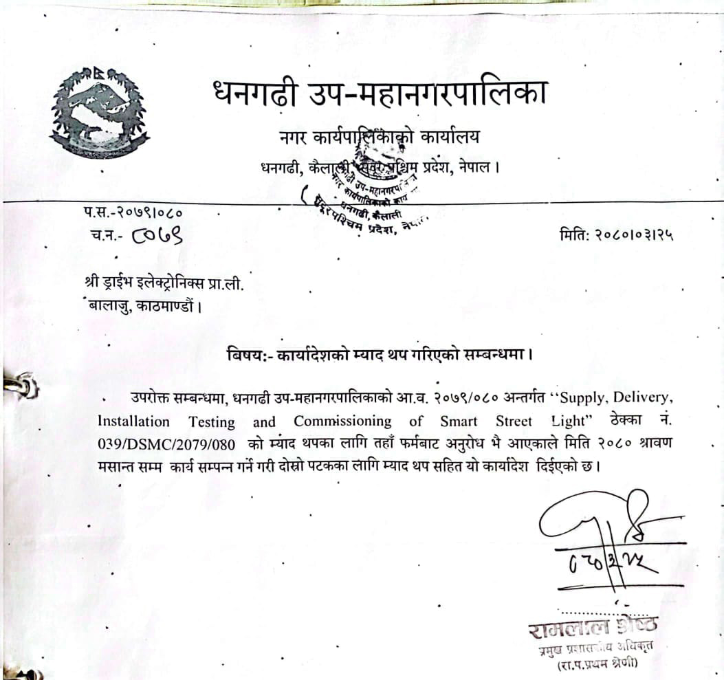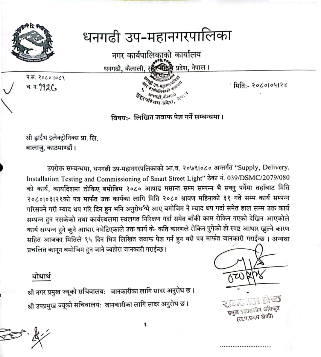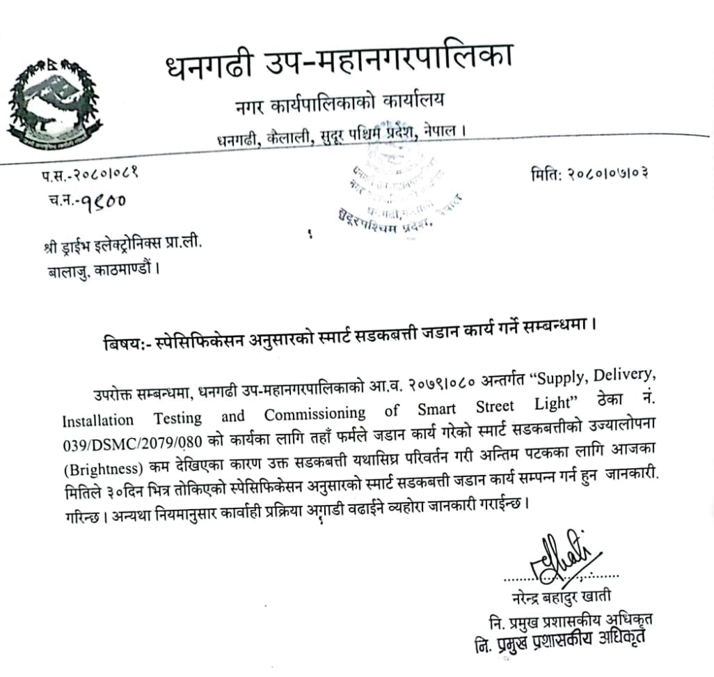 निर्माण व्यवसायी ड्राईभ इलेक्ट्रोनिक्स प्रालि बालाजुलाई पत्राचार गर्दै निमित्त प्रमुख प्रशासकीय अधिकृत नरेन्द्र बहादुर खातीले स्मार्ट सडकबत्ती जडान नभए नियमानुसार कारवाही प्रक्रिया अगाडि बढाइने चेतावनी दिएको छ ।