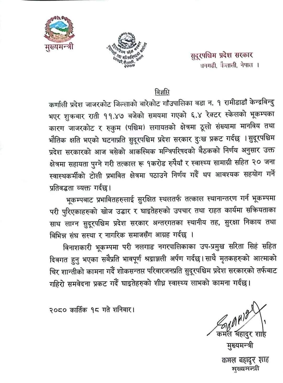 मुख्यमन्त्री कमलबहादुर शाहले प्रेस विज्ञप्ति जारी गर्दै जाजरकोट जिल्लालाई केन्द्रबिन्दु बनाएर गएको भूकम्पबाट भएको ठूलो धनजनको क्षतिप्रति गहिरो दुःख व्यक्त गर्दै सहयोग गर्ने निर्णय गरेको जनाएका छन् ।