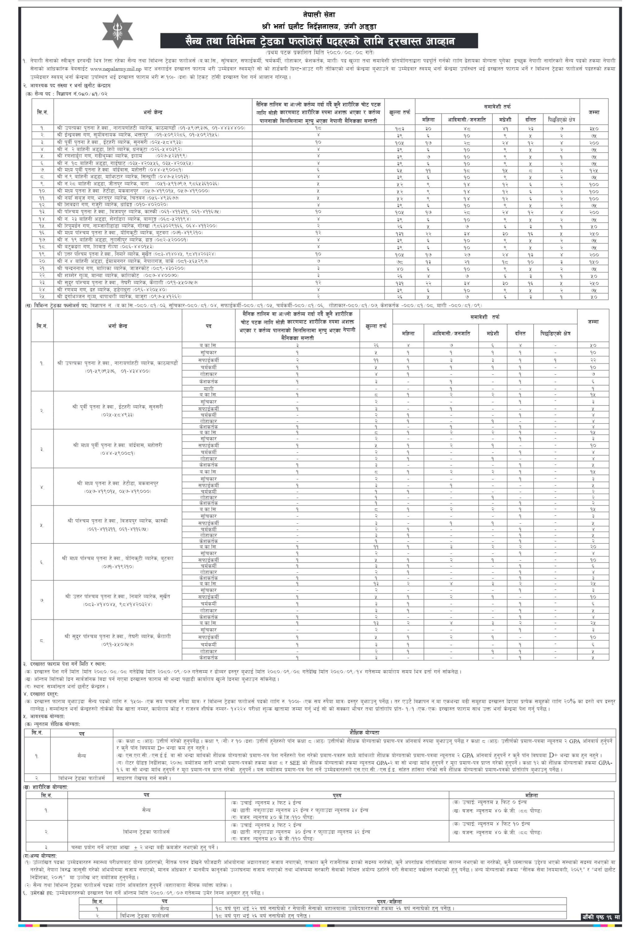 सैन्यतर्फ देशभर विभिन्न २५ ठाउँका लागि रोजगारी खुलेको छ । विज्ञापनमा खुला, महिला, आदिवासी/जनजाति, मधेशी, दलित र पिछडिएको क्षेत्रलाई छुट्टाछुट्टै सिट निर्धारण गरिएको छ ।