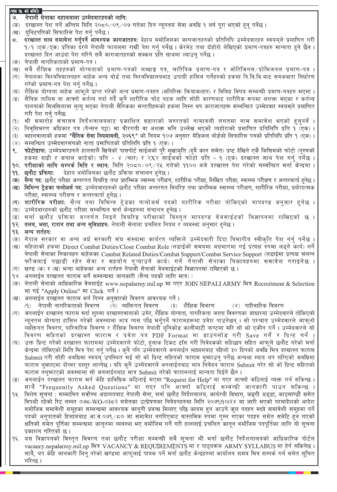 विज्ञापनमा सैन्यतर्फ ८ कक्षा पास र विभिन्न ट्रेडका फलोअर्स साधारण लेखपढ योग्यता निर्धारण गरिएको छ । सैन्य क्षेत्रमा शारीरिक योग्यता छुट्टै निर्धारण गरिएको छ ।