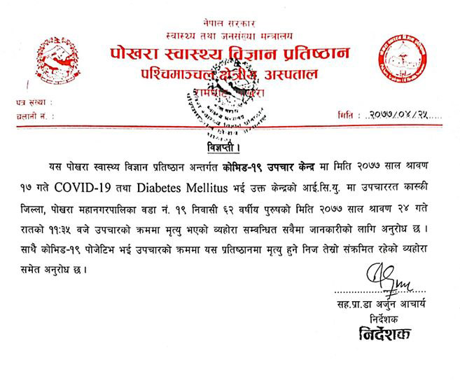 पोखरा स्वास्थ्य विज्ञान प्रतिष्ठानले आईतबार बिहानै प्रेस विज्ञप्ति जारी गर्दै कोरोनाले ६२ वर्षीय पुरुषको मृत्यु भएको पुष्टि गरेको हो ।