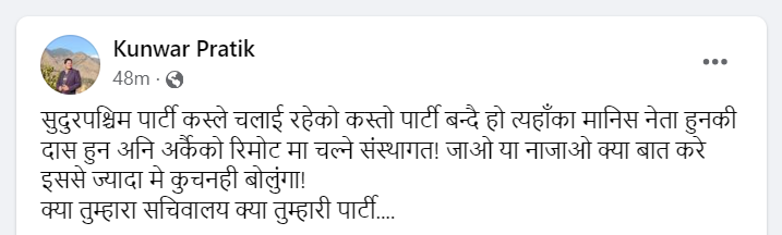बैतडी जिल्लाबाट प्रतिनिधित्व गर्ने केन्द्रीय सदस्यलाई सचिवालयमा नराखिएपछि केही नेता, कार्यकर्ताले टिप्पणी गरेका छन् । माओवादी नेता प्रतिक कुँवरले सामाजिक सञ्जालमा टिप्पणी गरेका छन्, ‘ सुदूरपश्चिम पार्टी कसले चलाइरहेको छ ? कस्तो पार्टी बन्दै हो ? त्यहाँका मानिस नेता हुन् कि दास हुन् ? अनि अर्कैको रिमोर्टमा चल्ने संस्थागत ! क्या तुम्हारा सचिवालय क्या तुम्हारी पार्टी …’