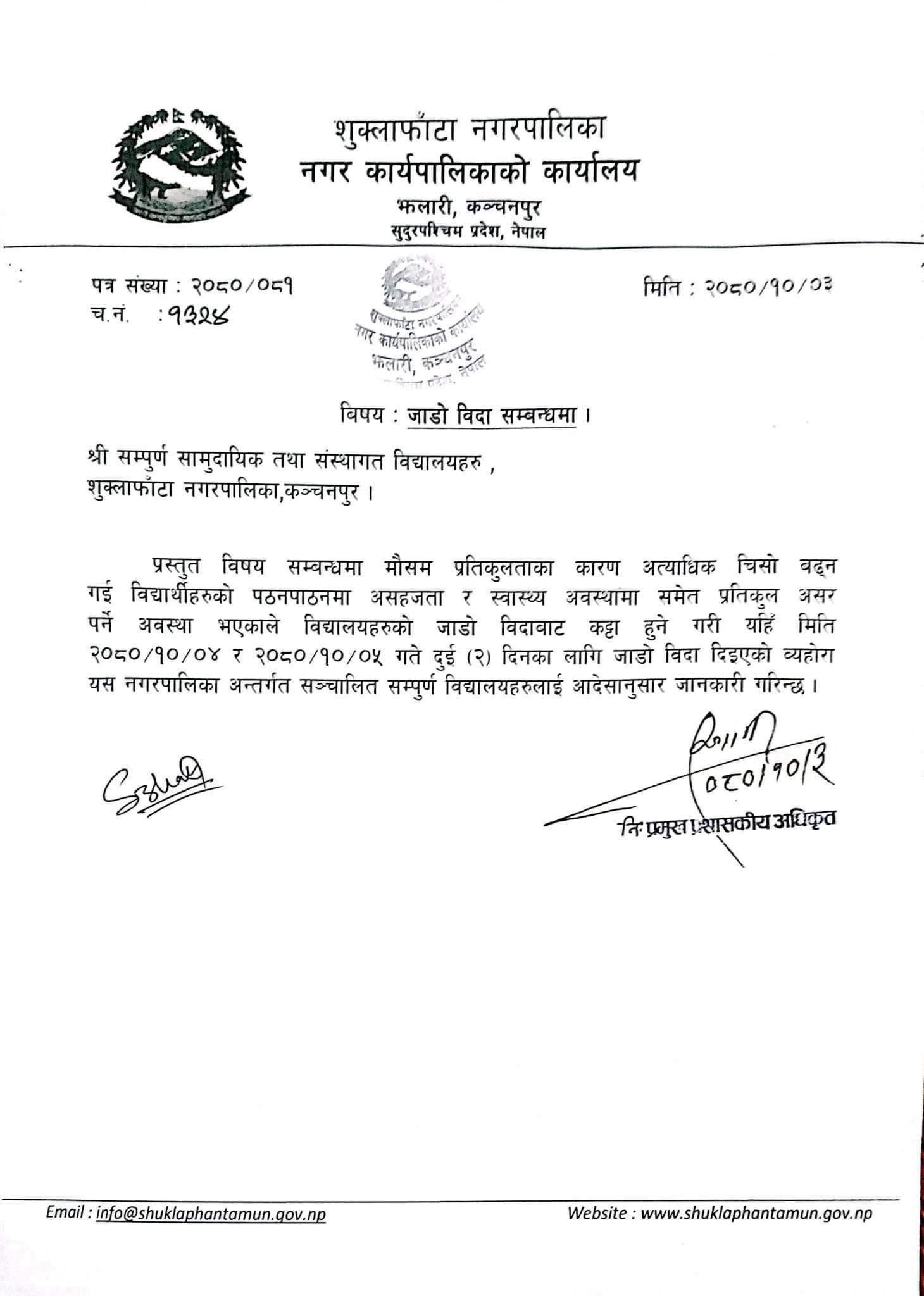 झलारी । कञ्चनपुरको शुक्लाफाँटा नगरपालिकाले भोलि बिहीबार र पर्सि शुक्रबार २ दिन जाडो बिदा गरेको छ ।