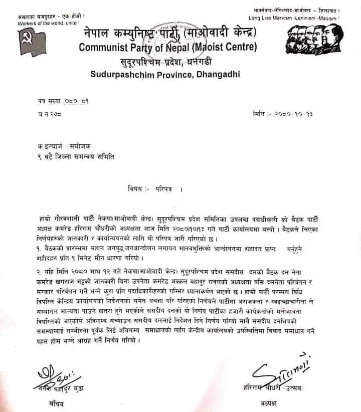 पार्टीको परिपत्रमा भनिएको छ, ‘यही मिति २०८० माघ १२ गते नेकपा (माओवादी केन्द्र) सुदूरपश्चिम प्रदेश संसदीय दलको बैठक दल नेता कमरेड खगराज भट्टको जानकारी विना उपनेता कमरेड अक्कलबहादुर रावलको अध्यक्षता बसी दल नेता परिर्वतन र सरकार परिर्वतन गर्ने भन्ने कुराप्रति पदाधिकारीहरूको गम्भीर ध्यानाकर्षण भएको छ । हाम्रो पार्टी परम्परा विधि विपरित केन्द्रीय कार्यालयको निर्देशनको समेत अवज्ञा गरी गरिएको निर्णयले पार्टीमा अराजकता र स्वेच्छाचारिताले संस्थागत मान्यता पाउने खतरा हुने भएकाले संसदीय दलको निर्णय पार्टीका हजारौं कार्यकर्ताको मनोभावना विपरितको भएकोले अविलम्ब सच्याउन संसदीय दललाई निर्देशन दिने निर्णय गरियो ।’