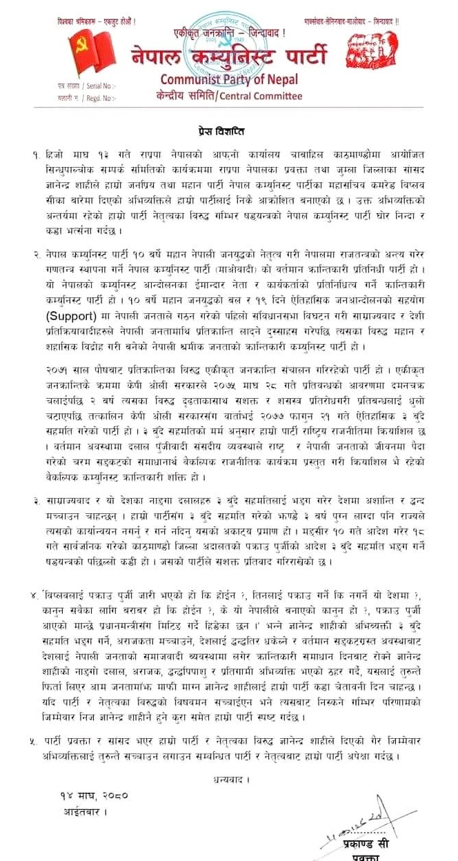 नेकपा प्रवक्ता खड्गबहादुर विश्वकर्मा ‘प्रकाण्ड’ले प्रेस विज्ञप्ति जारी गर्दै नेकपा महासचिव विप्लवविरुद्ध दिएको अभिव्यक्ति फिर्ता लिएर माफी माग्न शाहीलाई चेतावनी दिएको छ ।